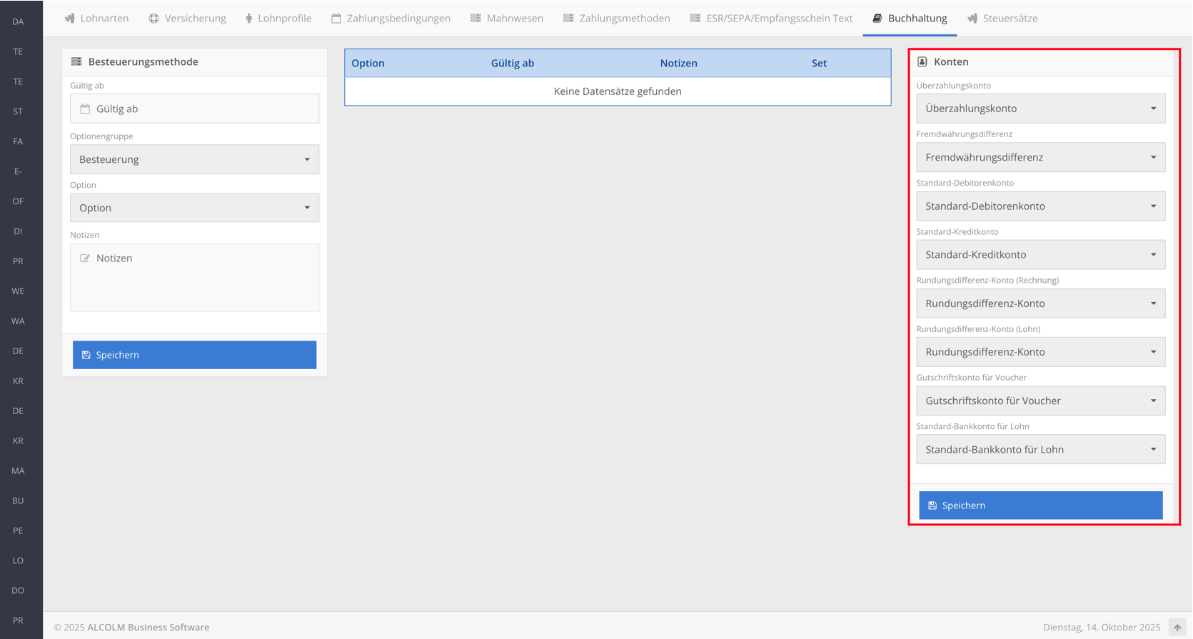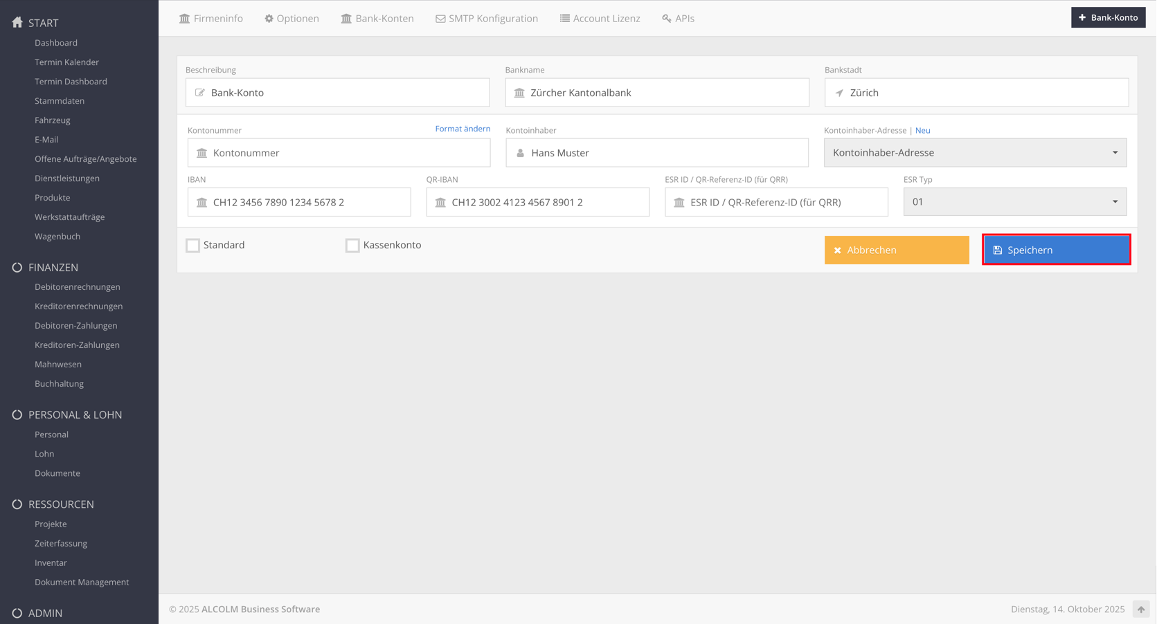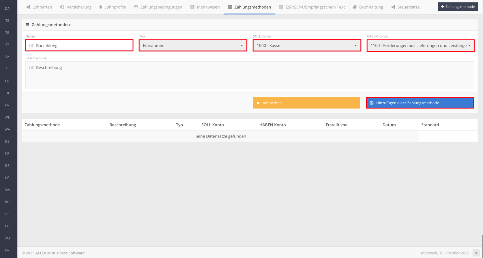 Füllen Sie die Felder mit den Standard Zahlungsmethoden aus und klicken Sie auf "speichern"