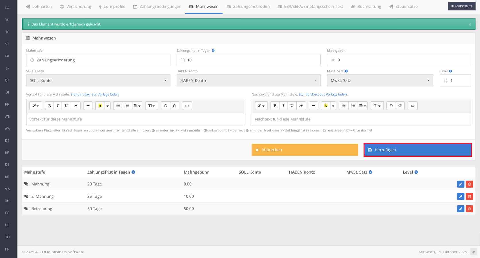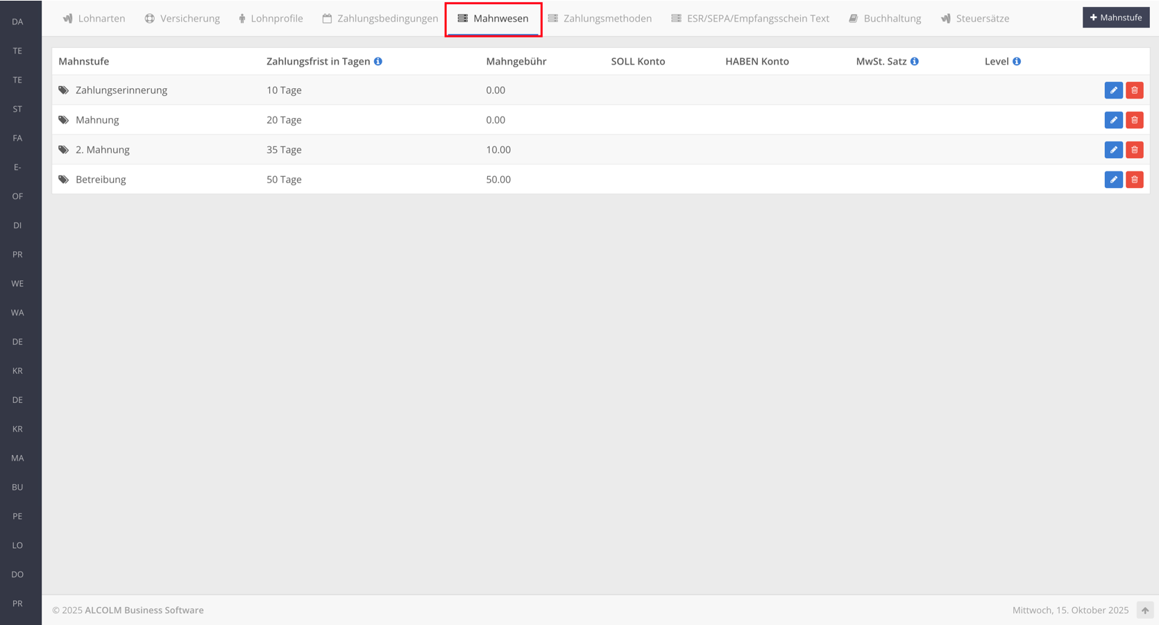 Nach dem Erstellen sollten die Mahnstufen wie folgt angezeigt werden:
