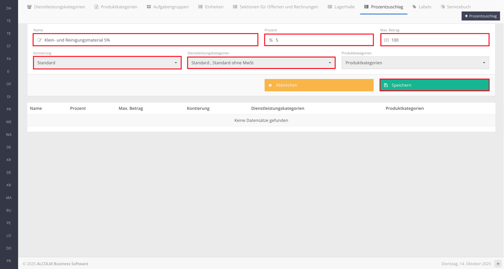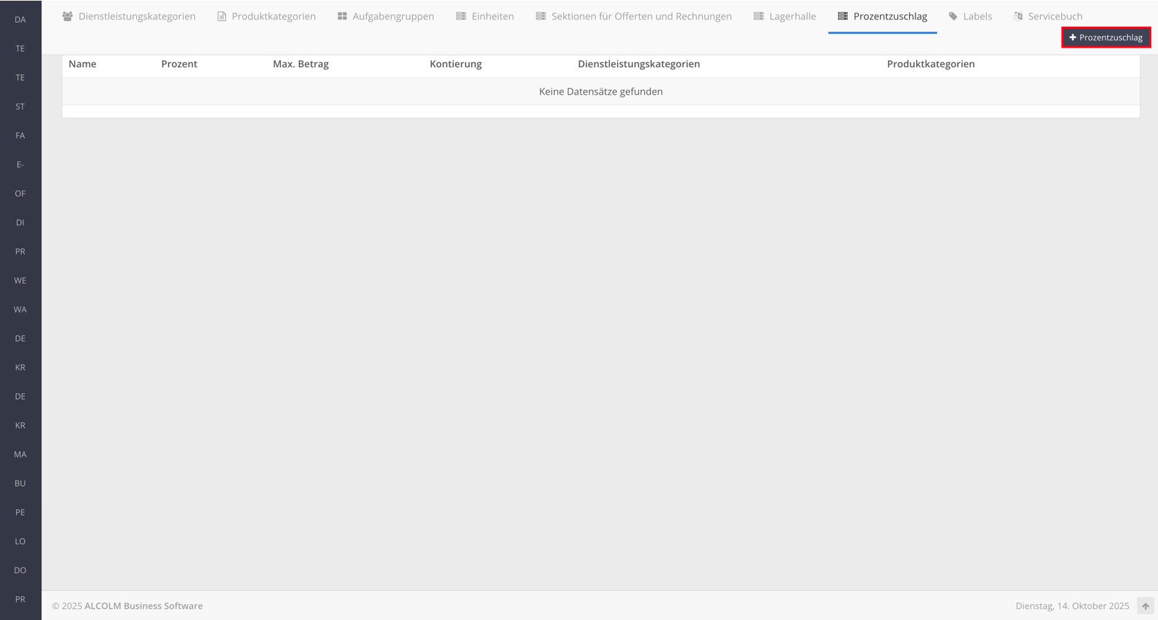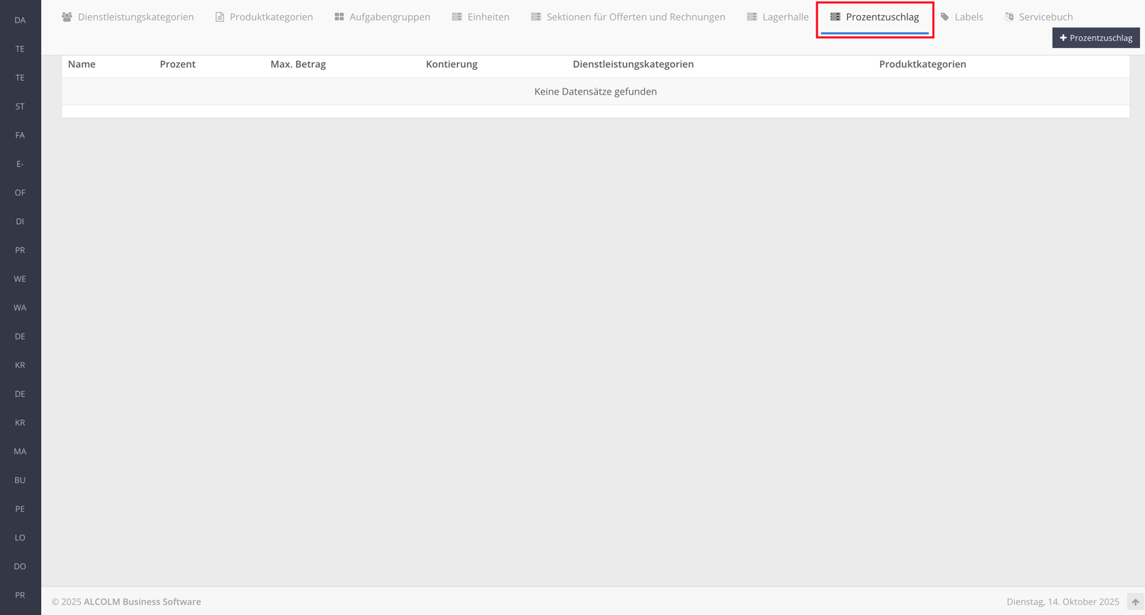 Klicken Sie auf + Prozentzuschlag, um einen neuen Prozentzuschlag zu erstellen.