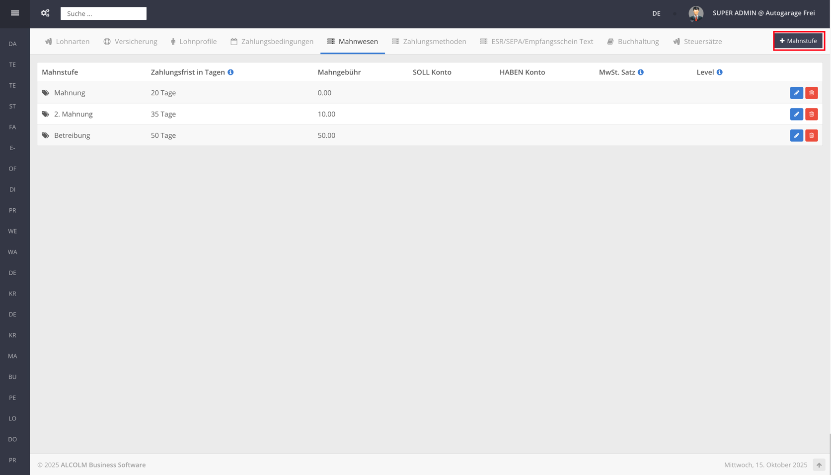 Klicken Sie oben rechts auf + Mahnstufe, um eine neue Mahnstufe zu erstellen.