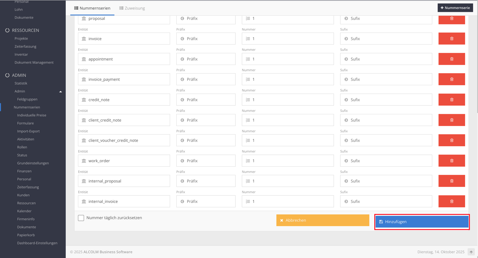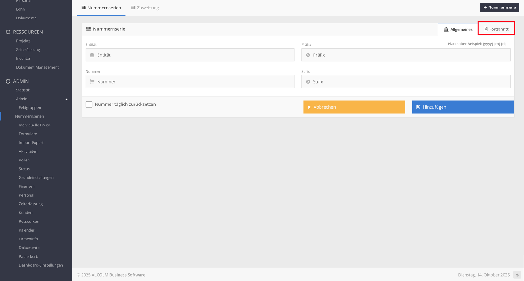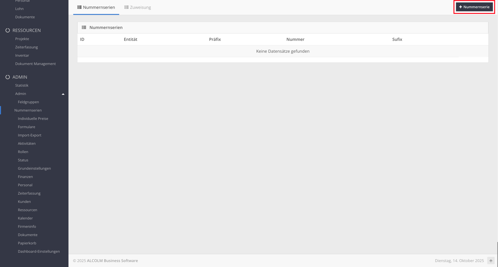 Klicken Sie auf + Nummernserie, um eine neue Serie zu erstellen.