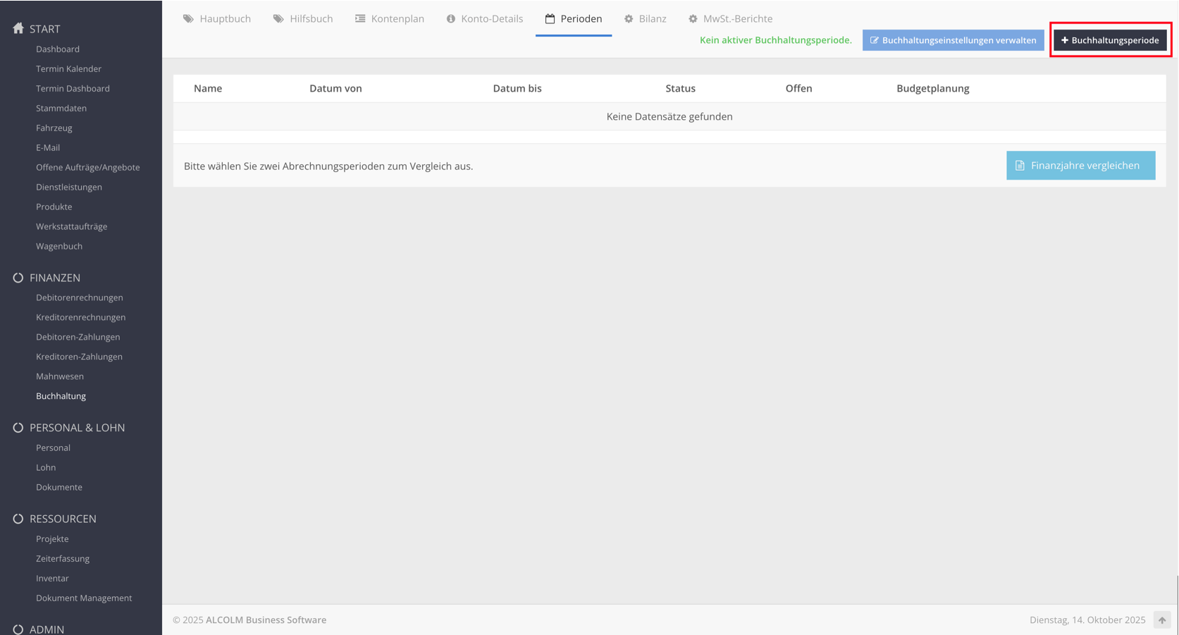 Klicken Sie auf + Buchhaltungsperiode, um ein neues Finanzjahr zu erstellen.