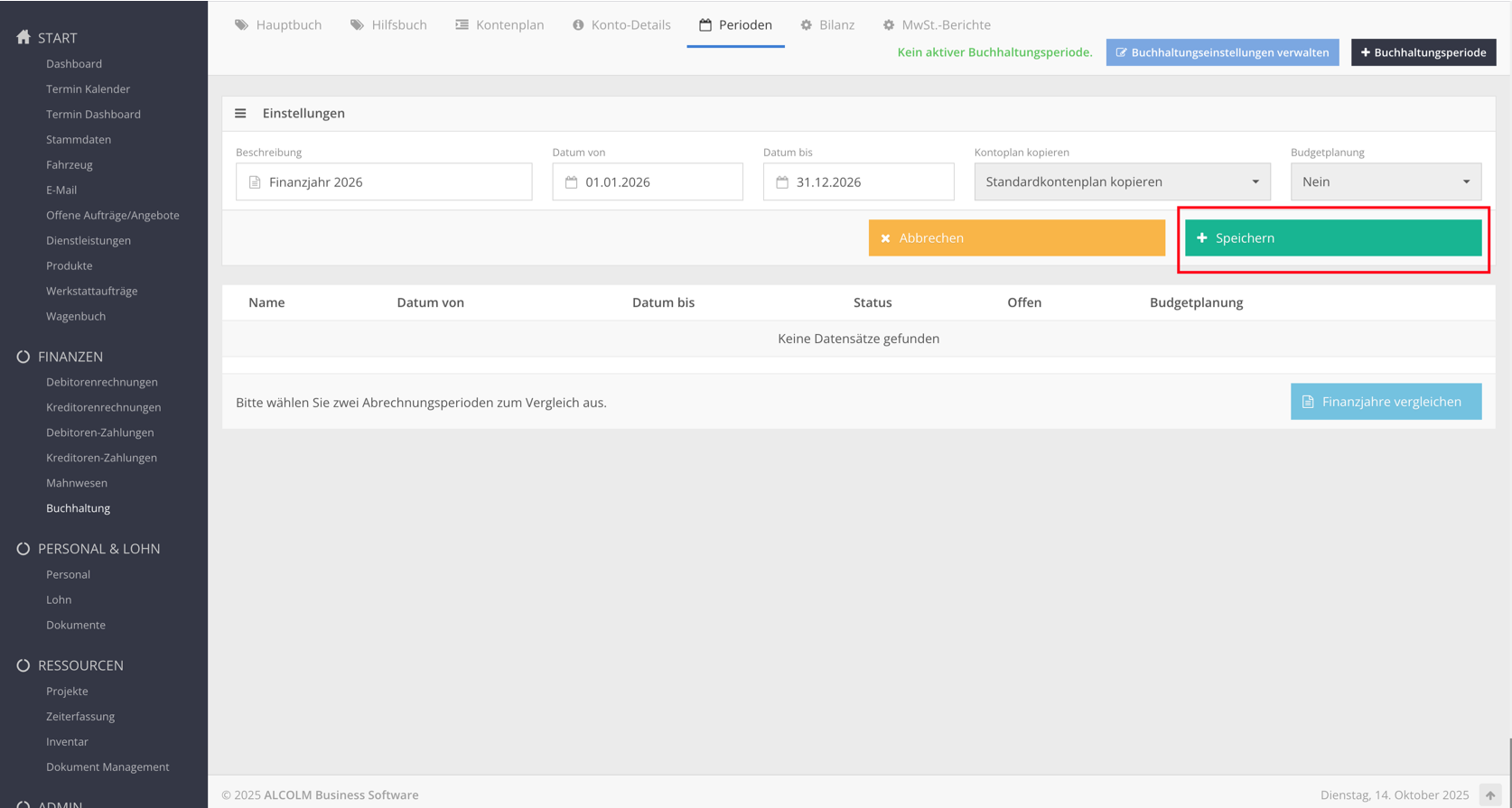 Klicken Sie auf Speichern, um das Finanzjahr zu erstellen.