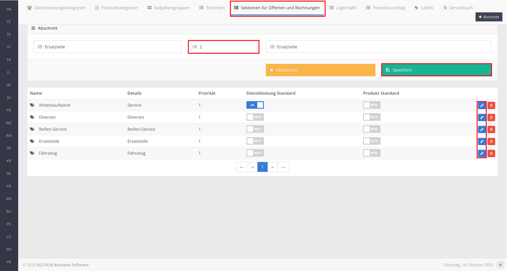 Wechseln Sie in den Tab Sektionen für Offerten und Rechnungen.