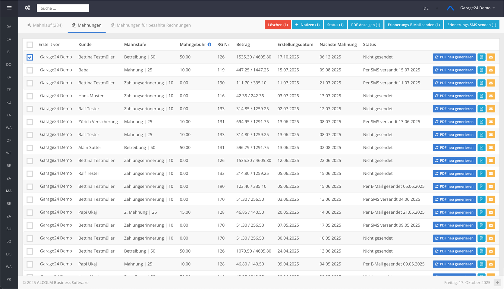 Wählen Sie die gewünschte Mahnung aus und klicken Sie oben rechts auf Löschen.